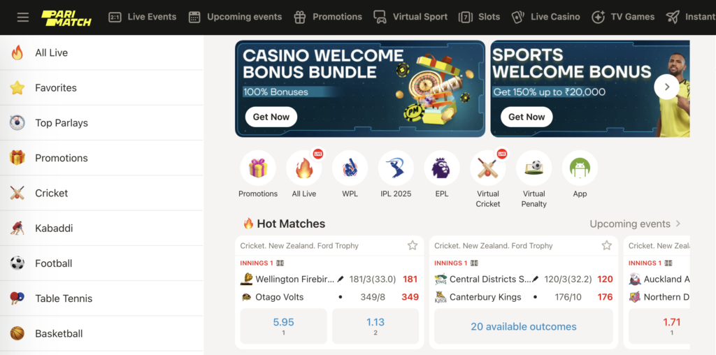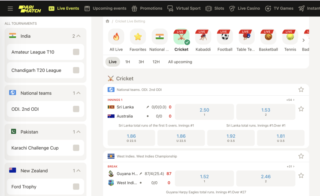 Apart from the pre-match section, Parimatch India also provides impressive live betting. Up-to-date statistics and odds incorporate the latest details about the teams.